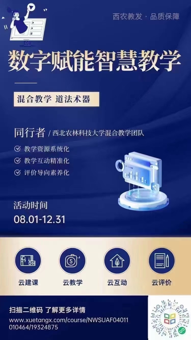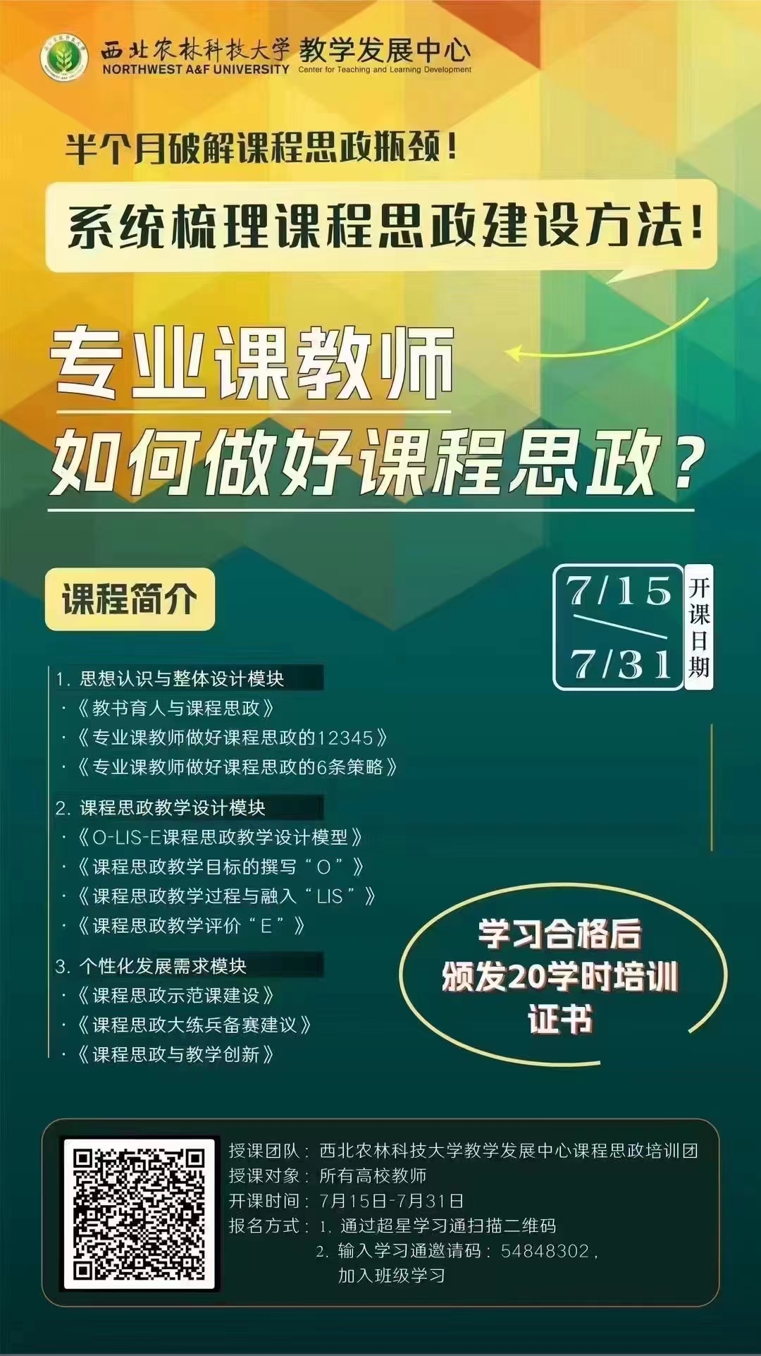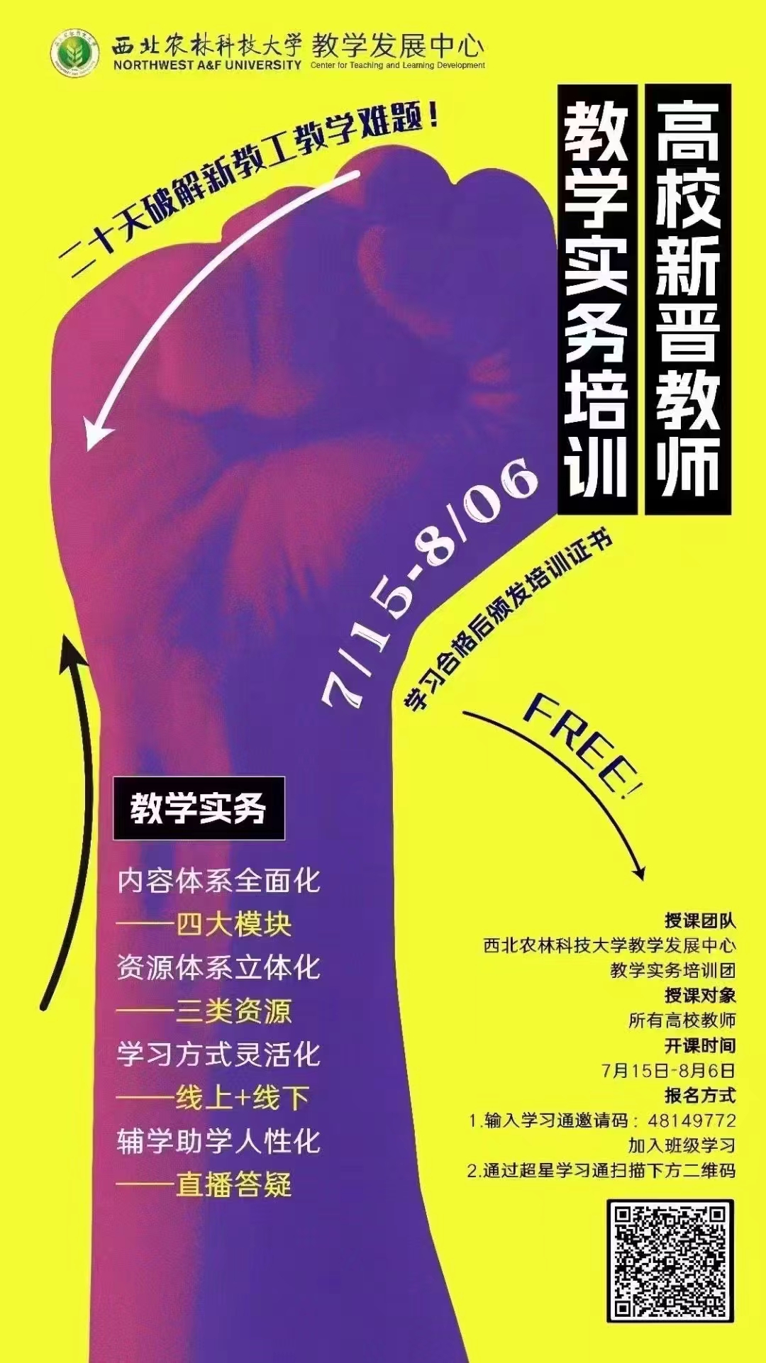 为提高新入职教师教学能力和业务水平,进一步加强教师队伍建设,强化新入职教师岗前培训,促进新教师的专业成长,帮助新教师尽快熟悉业务,使新入职教师尽快适应教育教学工作,学校联合西北农林科技大学教师发展中心培训资源组织新晋教师参加网络教学培训。现将有关事宜通知如下: