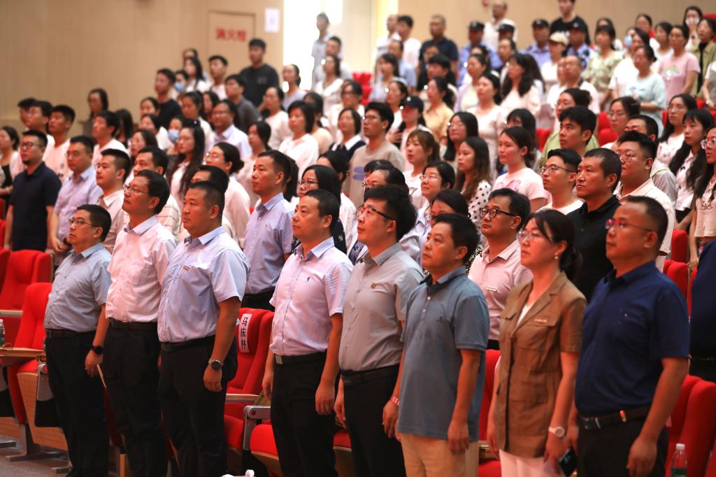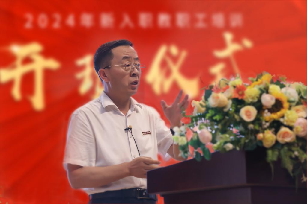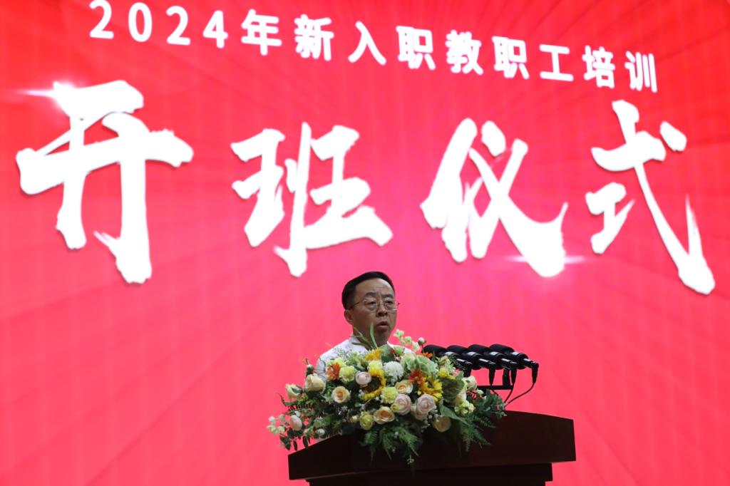 新入职教职工培训开班仪式在雄壮的《中华人民共和国国歌》声中开幕;ac米兰官方网站副书记、副校长白秦川介绍2024年新入职教职工培训目的及意义。他代表学校对各位新同事的到来表示热烈欢迎和最诚挚的问候!同时对参会的领导表示感谢。