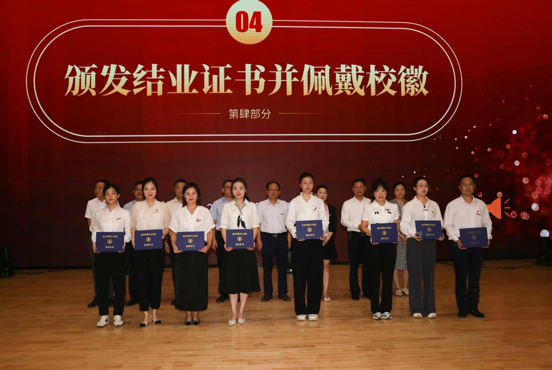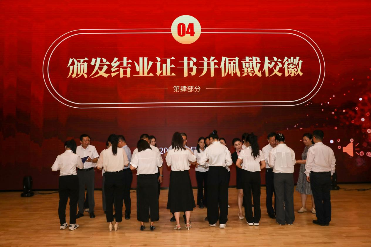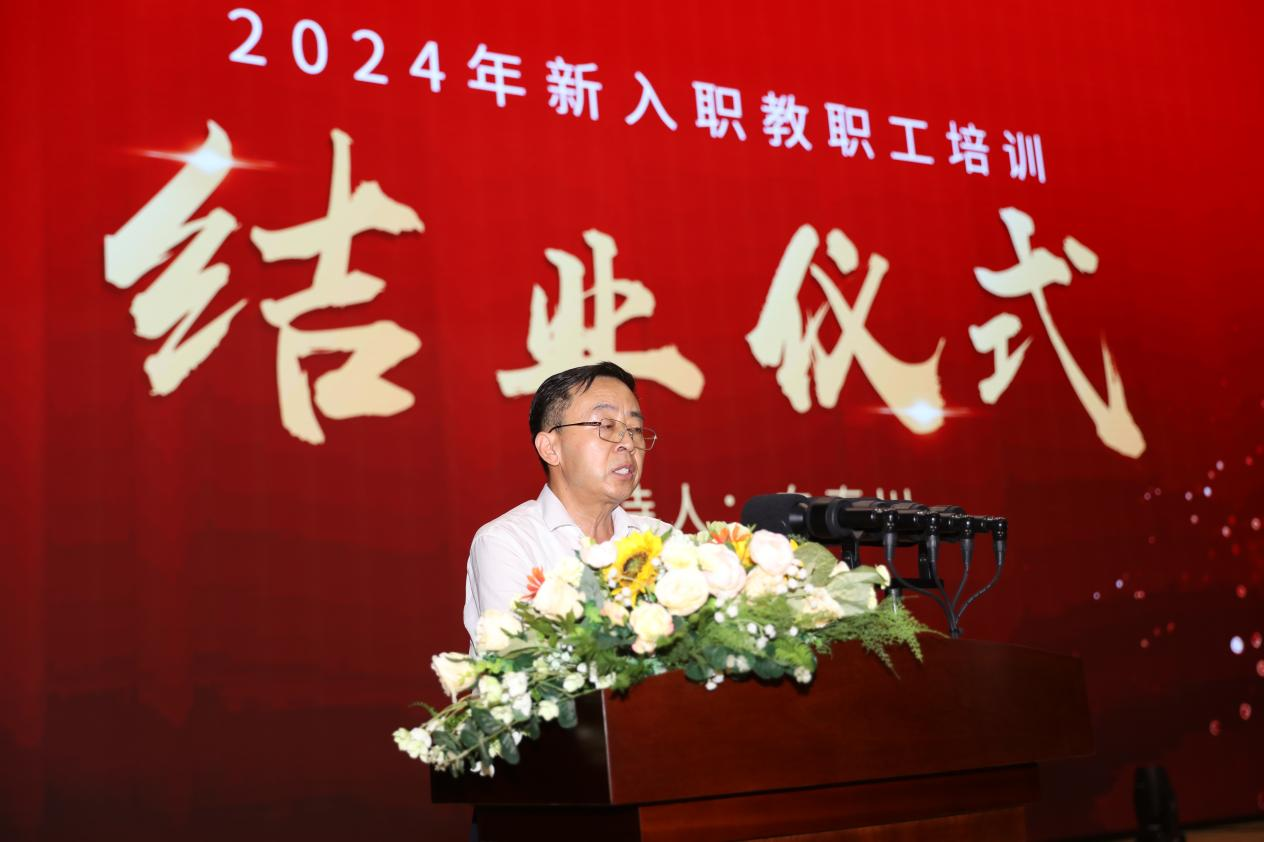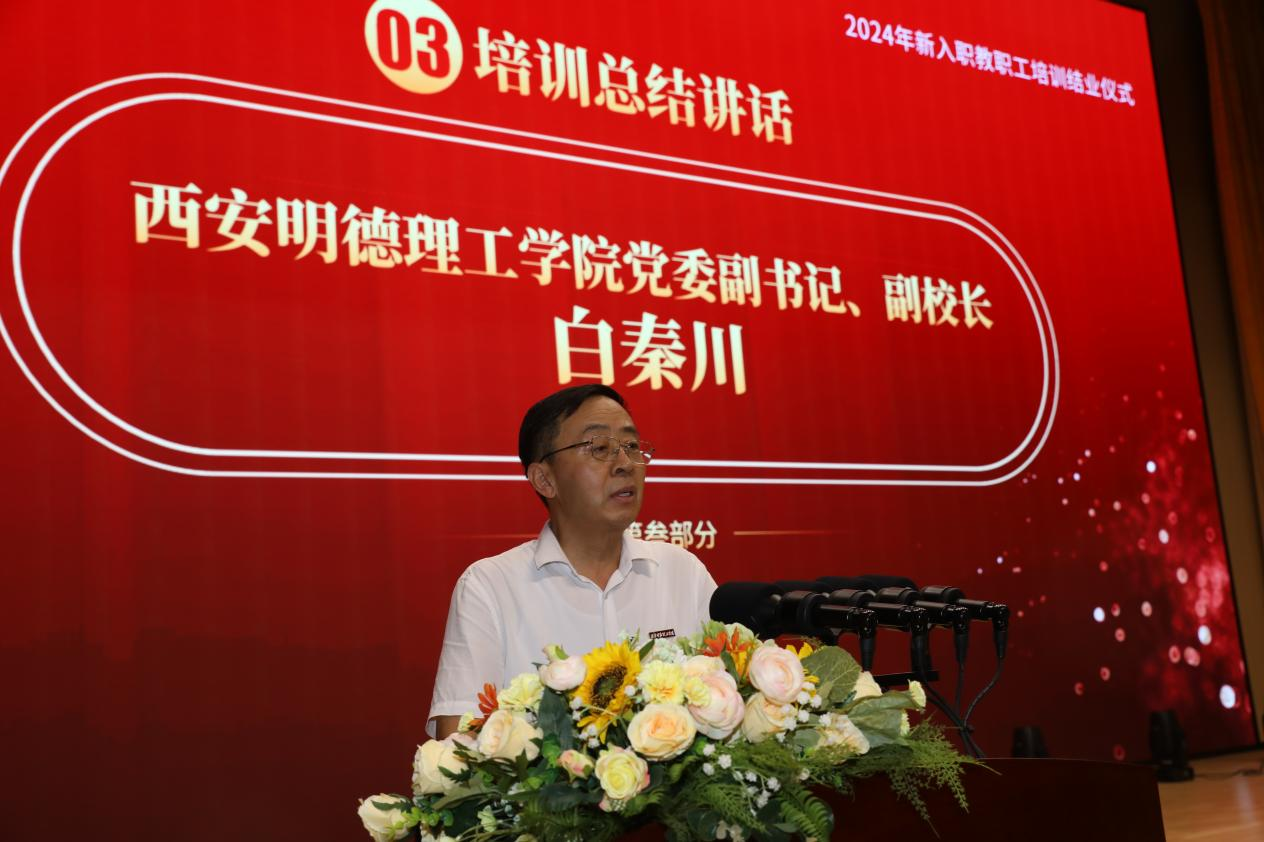 2024年8月30日上午,学校新入职教职工培训班结业式在四季廊桥报告厅隆重举行。明德源教育集团助理总裁、学校副董事长张琳,学校校长王志刚,党委书记马川鑫,党委副书记、副校长、纪委书记白秦川,副校长朱延波、陈鹏、王斌宁,财务总监马晓军及集团财务总监田雪,招教部总经理、总裁办主任马杨利,总裁办副主任李龙飞出席结业式,二级学院院长、党委书记、副院长、办公室主任、职能部门、教辅单位中层及科级干部及新入职教职工近400人参加,结业式由学校党委副书记、副校长、纪委书记白秦川主持。