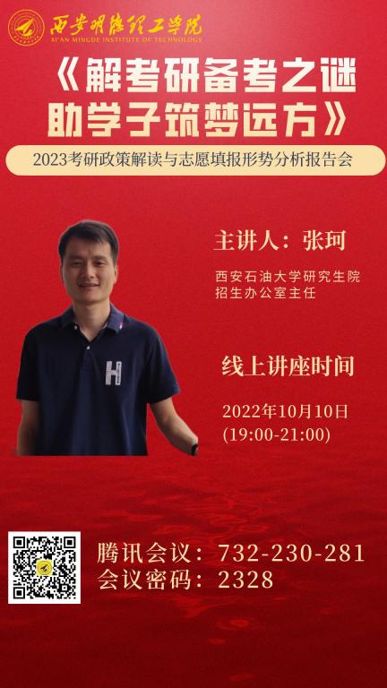 为帮助学生树立正确的考研理念,全面了解考研信息,合理选择报考院校,科学制定备考规划,我们特邀西安石油大学研究生院招生办公室主任张珂老师为ac米兰2023届、2024届学生进行《解考研备考之谜,助学子筑梦远方》考研形势分析报告会。因疫情防控要求,报告会以腾讯会议方式线上进行。