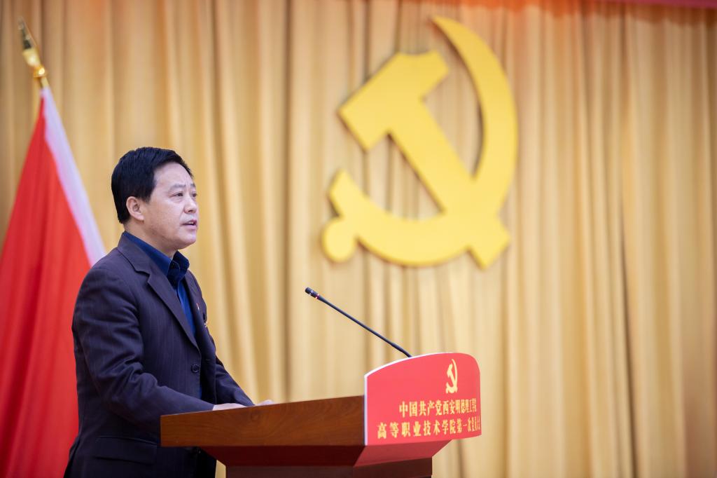 大会在庄严的国歌声中开幕。高等职业技术学院院长舒忠对大会的顺利召开表示热烈的祝贺!他在致辞中回顾了学院自成立以来取得的显著的成绩,。分享了学院未来发展的蓝图构想和面临的新机遇新挑战,号召全院党员要以此次党员大会为新征程,积极作为、踔厉奋发,不忘立德树人初心,牢记为党育人、为国育才使命,同心同力,同向同行,积极推进学院高质量向前发展。