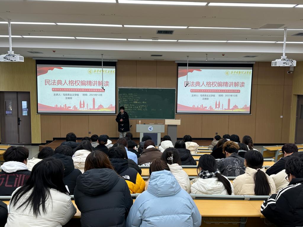 2023年12月19日,马克思主义学院王婉菲老师为大家重点解读了中华人民共和国首部民法典之人格权。以《民法典》中的亮点内容为主线,向同学们进行了细致讲解,很好地展示了法律的实用性和普遍性。在法律面前,每一个生命都应该得到尊重和保障,这是立法的本源,也是司法的核心。《民法典》所形成的对每一个自然人全方位的保护体系,切实体现了“以人民为中心”的立法理念,彰显了《民法典》作为权利法典的根本属性。同时告诫同学们要从自身做起,加强思想道德修养和自我保护意识,要善于运用法律武器维护自己的合法权益。