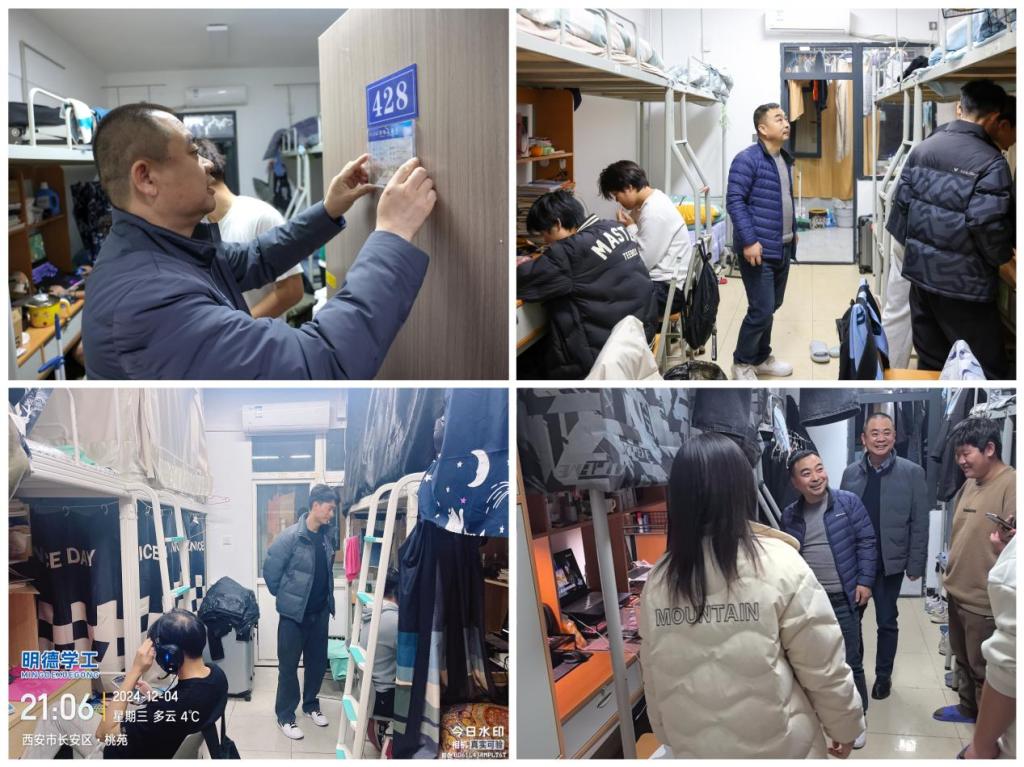 为加强学生宿舍安全管理,排查宿舍各类安全隐患,12月4日晚,高等职业技术学院的党总支书记王庭良、副书记王飞以及全体辅导员,联合学校“一站式”学生社区开展了一场全面细致的安全与卫生检查活动。此次检查涉及学院各个学生宿舍楼,覆盖全院学生宿舍。