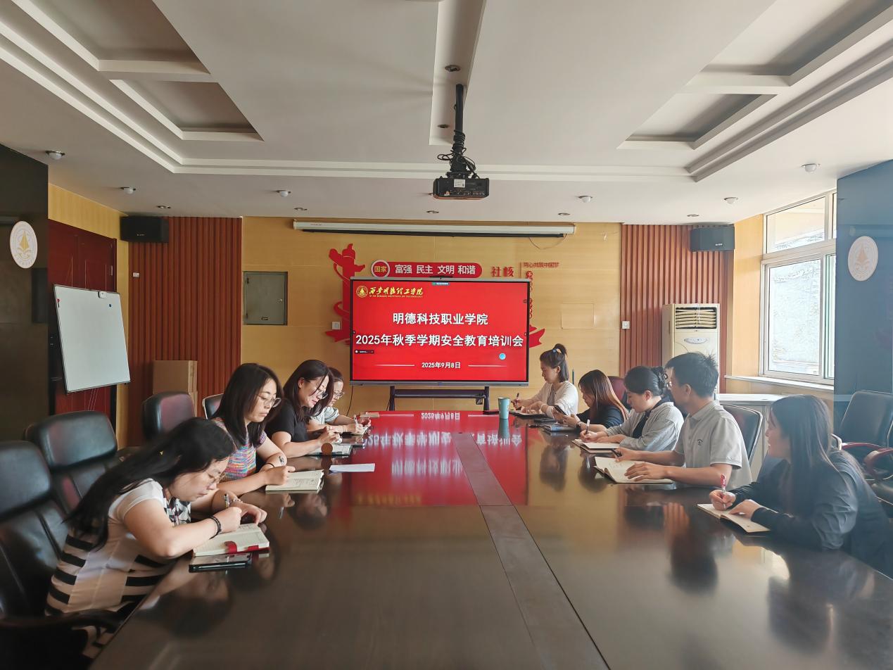 为筑牢校园安全防线,提升应急处置能力,强化学生安全意识,9月8日上午,明德科技职业学院在长安校区明理楼216会议室、莲湖校区德雅楼A102会议室召开2025年秋季学期安全教育培训会,党总支书记王庭良及全体辅导员参加会议,培训由学院党总支副书记王飞主讲。