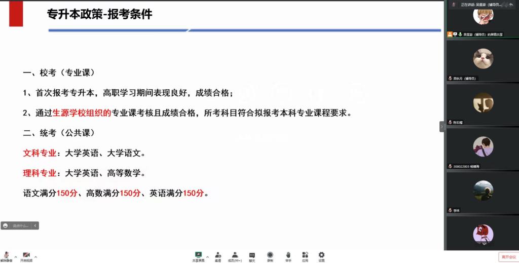 为了助力学子学历提升,推动学子成长成才。高等职业技术学院毕业班辅导员于10月15日—17日在线上召开了“全日制统招专升本政策解读”班会。