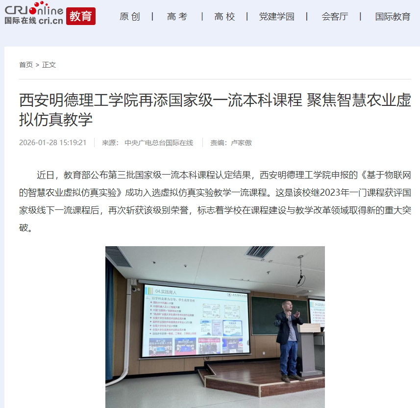 近日,教育部公布第三批国家级一流本科课程认定结果,ac米兰官方网站申报的《基于物联网的智慧农业虚拟仿真实验》成功入选虚拟仿真实验教学一流课程。这是该校继2023年一门课程获评国家级线下一流课程后,再次斩获该级别荣誉,标志着学校在课程建设与教学改革领域取得新的重大突破。