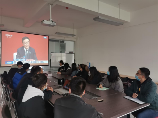 11月12日上午10时,信息工程学院党委书记李波、党委副书记高长江以及全院各党支部部分师生党员在明志楼北206集中收看了党的十九届六中全会精神举行的新闻发布会。