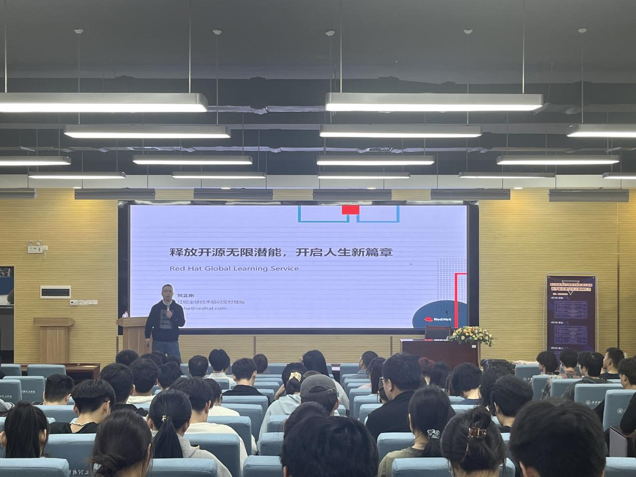 2024年4月18日19:00,红帽大中华区讲师团队负责人及Tech Lead贺正刚在建德楼201报告厅为ac米兰学生作“释放开源无限潜能,开启人生新篇章”主题讲座。本次讲座由国际教育学院(外事办公室)、信息工程学院、高等职业技术学院联合主办,共100余名学生参加。