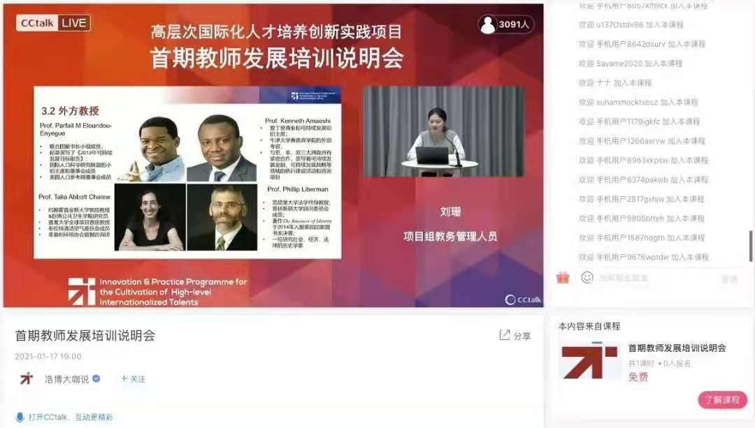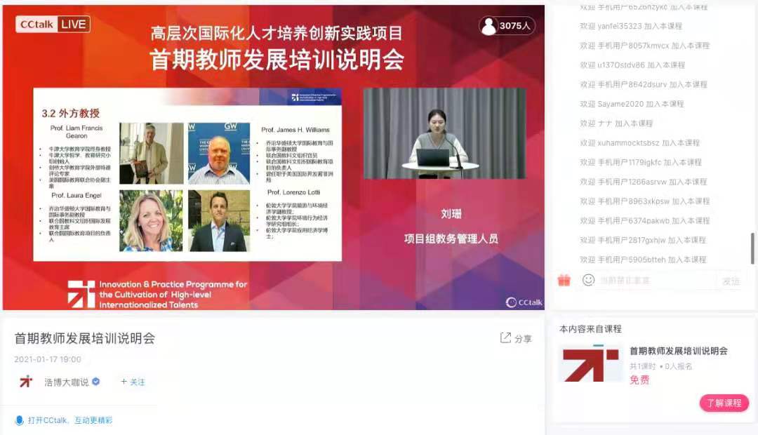 来自全国28所高校的3621名教师通过在线平台参与,首日课程视频观看量达1.7万次,目前累计观看量达4.8万次。教育部中外人文交流中心主任杜柯伟、原卫生部外事司司长宋允孚、美国康奈尔大学Parfait M Eloundou-Enyegue教授、英国牛津大学Liam Francis Gearon教授等10位主讲人在五天内分别就高层次国际化人才培养及相关课程设计做了专题报告和优质课程案例培训。