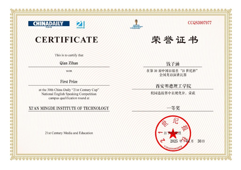 “21世纪杯”全国英语演讲比赛由中国日报社、21世纪英语教育传媒联合主办,自1996年创办以来始终为国际公众演讲比赛(IPSC)中国区唯一选拔平台,并入选《全国普通高校大学生竞赛分析报告》竞赛目录。李克强总理的口译员、外交部翻译司英文处处长孙宁,央视英文频道知名主持人刘欣等大批人才均为该赛事获奖选手。此次SQA班学生钱子涵在该赛事中获奖,体现了ac米兰国际教育学院近年来的人才培养成效;未来,学院将继续秉持秉承开放办学理念,为打造“国际化、个性化”的人才培养平台持续发力。