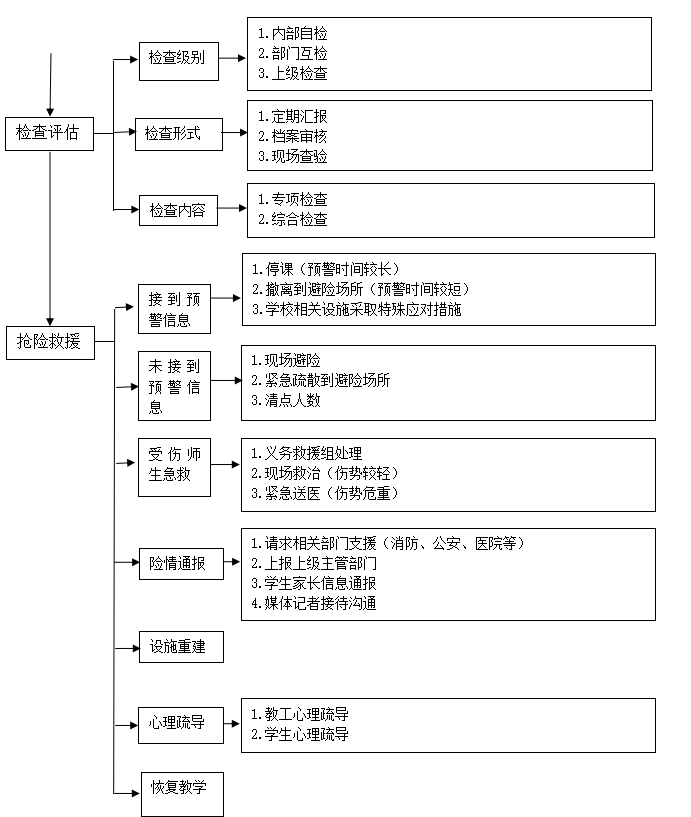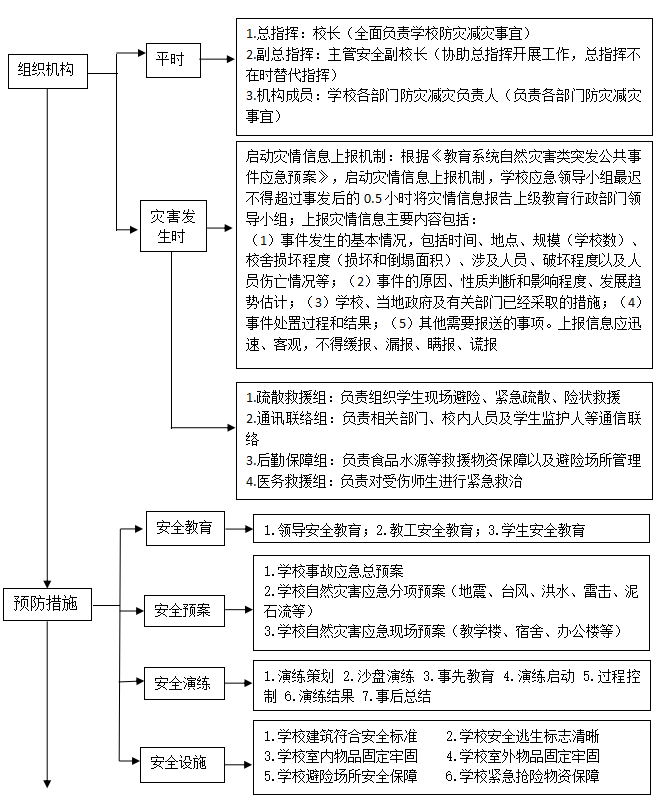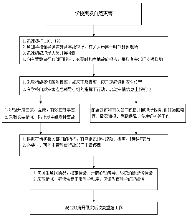 一旦发生灾害,做到及时上报,果断处置,确保发现、报告、指挥、处置等环节的紧密衔接;学校各部门与政府相关职能部门协同应对,系统联动,形成统一指挥、协调有序的应急管理机制。