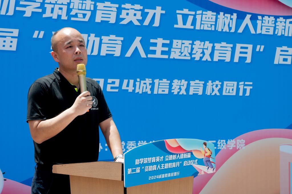 仪式最后,童杨梓宣布“第二届资助育人主题教育月”启动。他讲到学校建立了“奖、助、勤、贷、补、减、免”七位一体的学生资助政策,学校通过各类资助育人活动将感恩教育和资助帮扶有效结合,有助于培育学生自强自立、诚实守信、知恩感恩和回报社会等优秀品质,促进学生成长成才,鼓励同学们在新时代担当起新青年的责任。