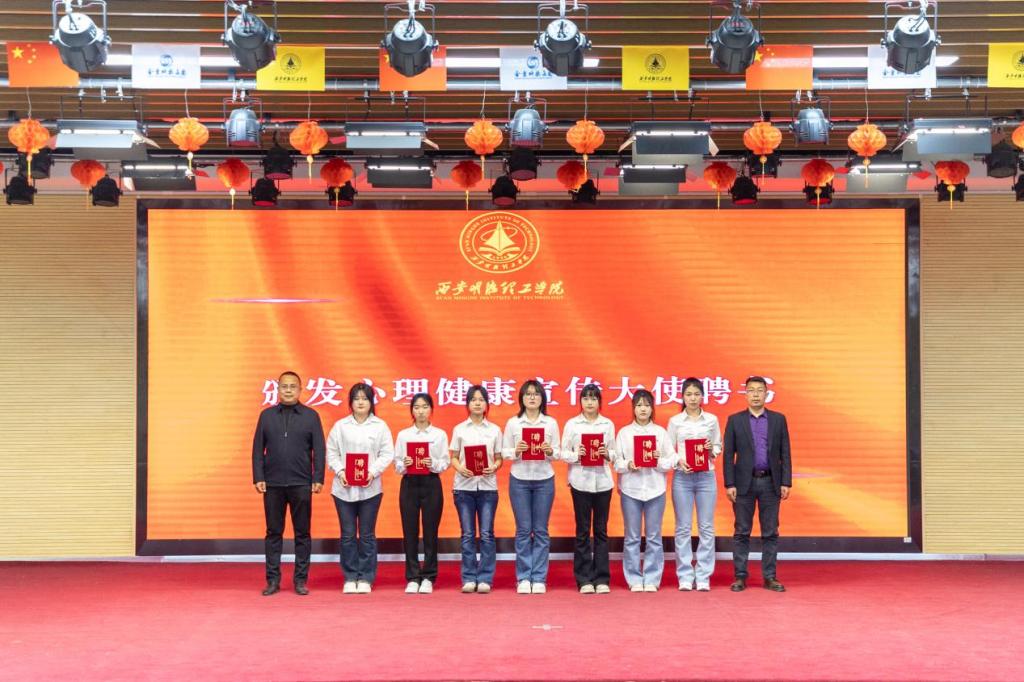 后勤管理处处长袁小勇、教务处副处长柳厚军为心理健康宣传大使颁发聘书。