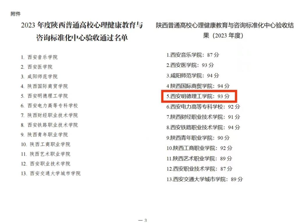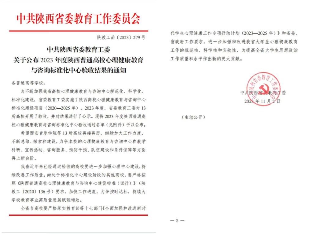 近日,中共陕西省委教育工委公布了《中共陕西省委教育工委关于公布2023 年度陕西普通高校心理健康教育与咨询标准化中心验收结果的通知》,学校顺利通过此次验收,大学生心理健康教育中心获评“陕西普通高校心理健康教育与咨询标准化中心”。