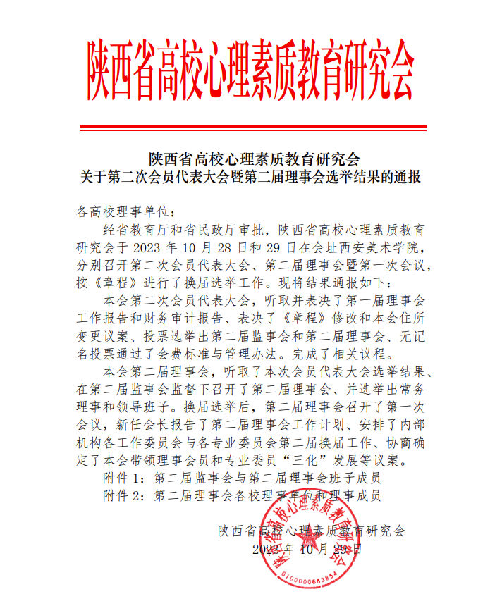 2023年10月28日-29日,陕西省高校心理素质教育研究会在会址西安美术学院分别召开第二次会员代表大会、第二届理事会暨第一次会议,按《章程》进行了换届选举工作。ac米兰官方网站入选为第二届理事会单位,党委学生工作部副部长童杨梓、大学生心理健康教育中心主任薛飘入选为第二届理事会理事。