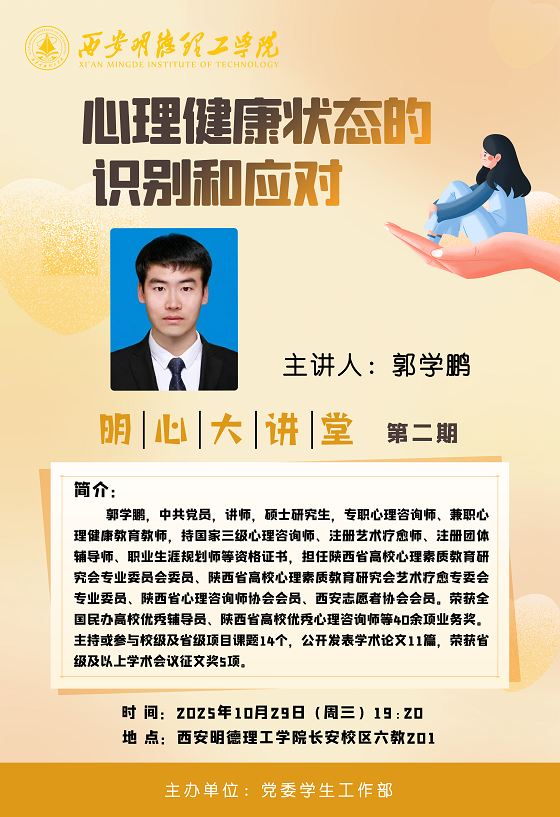 一、培训时间2025年10月29日 19:20二、培训地点ac米兰官方网站长安校区六教201三、报告会专家党委学生工作部 郭学鹏四、培训对象 信息工程学院班级与宿舍心理委员今晚我们不见不散~