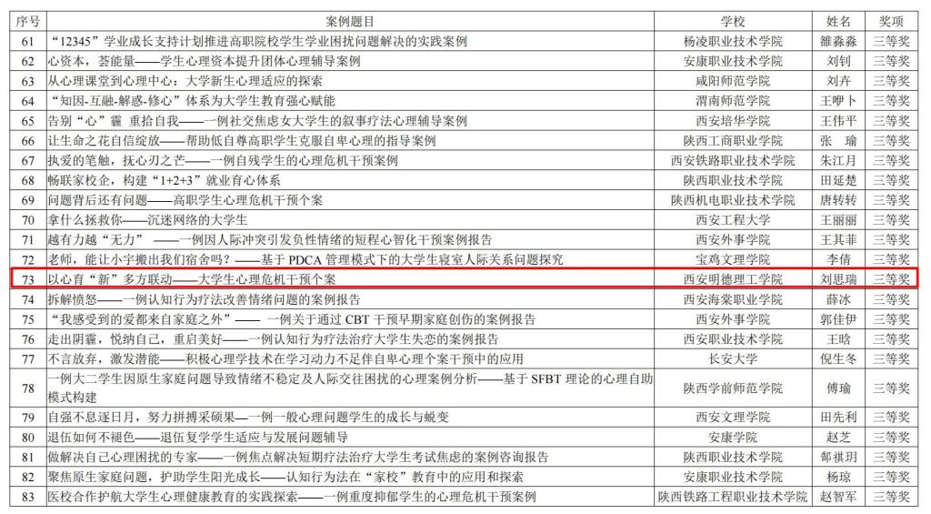 在2024年陕西高校学生心理健康教育指导典型案例推选活动中,艺术与设计学院辅导员党红娟的参赛作品《认知行为疗法与家庭系统疗法结合下的一例抑郁症大学生的心理创伤疗愈过程》荣获二等奖;艺术与设计学院辅导员的参赛作品《以心育“新”多方联动——大学生心理危机干预个案》荣获三等奖。