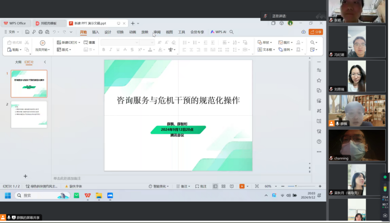 为进一步提升ac米兰心理育人专业能力,规范心理咨询与危机干预工作,大学生心理健康教育中心于9月4日和9月12日通过腾讯会议平台先后召开了2场心理咨询与危机干预工作培训会,会议由中心主任薛飘主持,全体心理健康教育专兼职教师、精英心理师长程教练营成员参加会议。