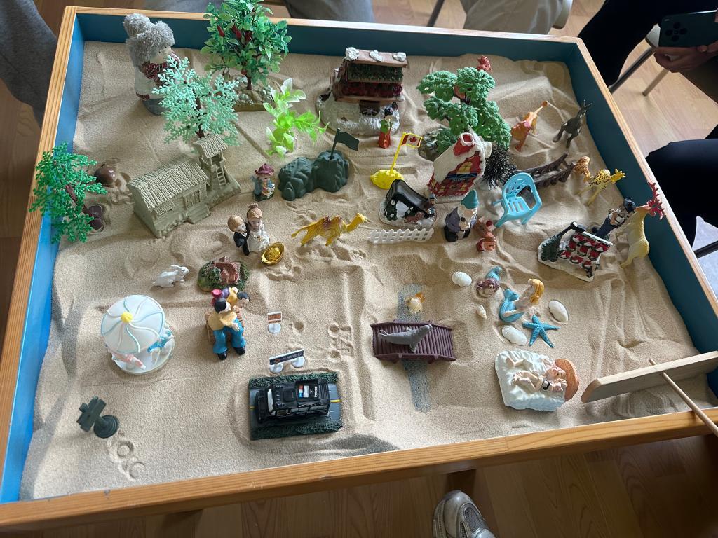 在正式开始前,闫梦娜带领同学们进行了简单的放松训练,帮助大家进入更加专注和开放的状态。随后,同学们按照抽签顺序依次选择沙具,在沙盘中自由摆放。整个过程中,她仔细观察每位同学的选择和摆放方式,适时给予引导和鼓励。经过多轮摆放,一个充满象征意义的“心灵花园”逐渐成型。