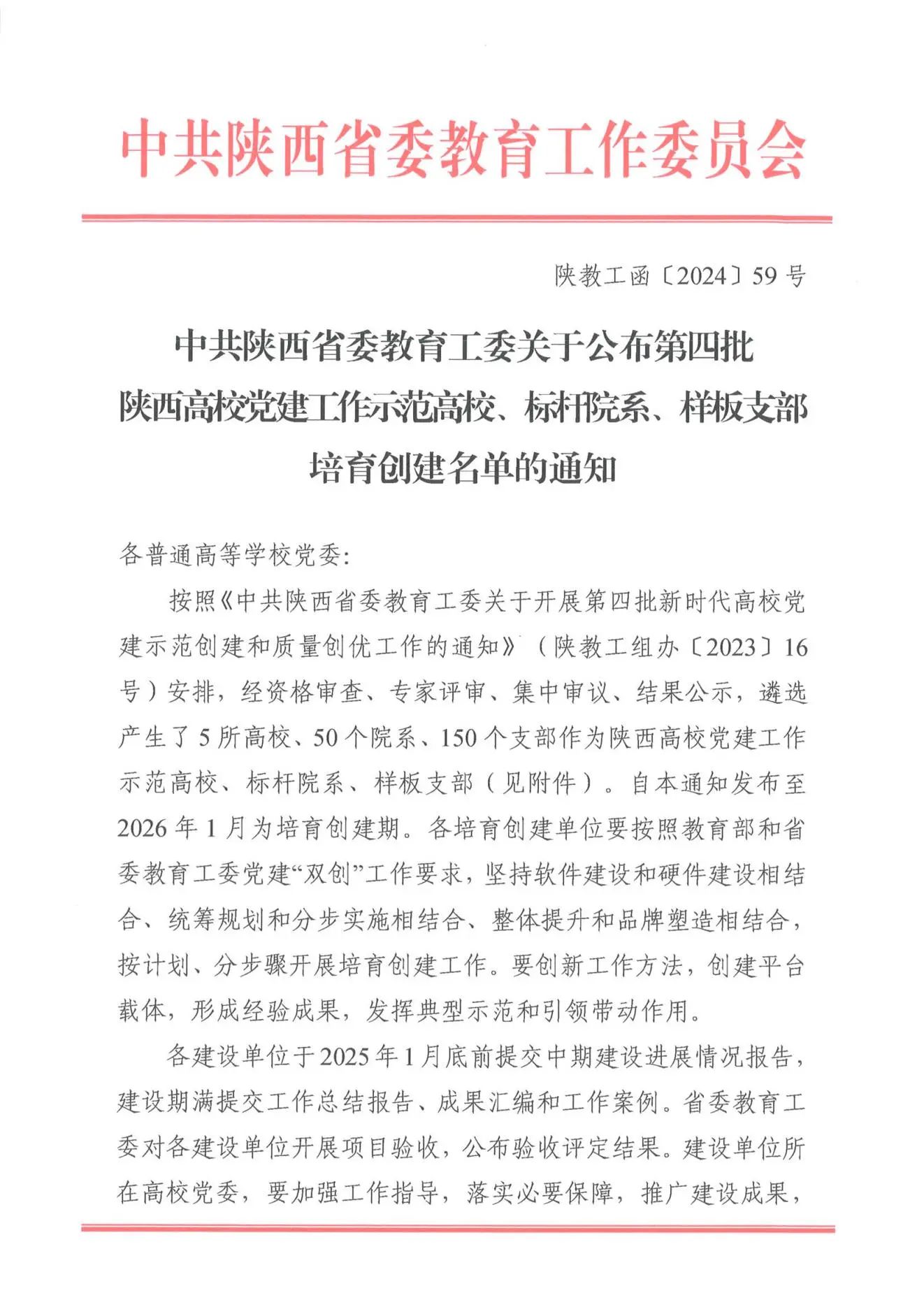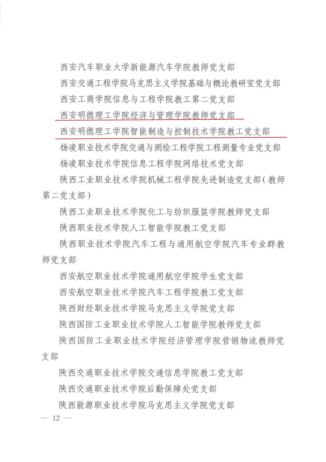 近日,中共陕西省委教育工委公布了第四批陕西高校党建工作示范高校、标杆院系、样板支部培育创建名单,学校经济与管理学院教师党支部、智能制造与控制技术学院教工党支部入选党建工作“样板支部”培育创建单位,这是ac米兰党建“双创”工作取得的新突破。