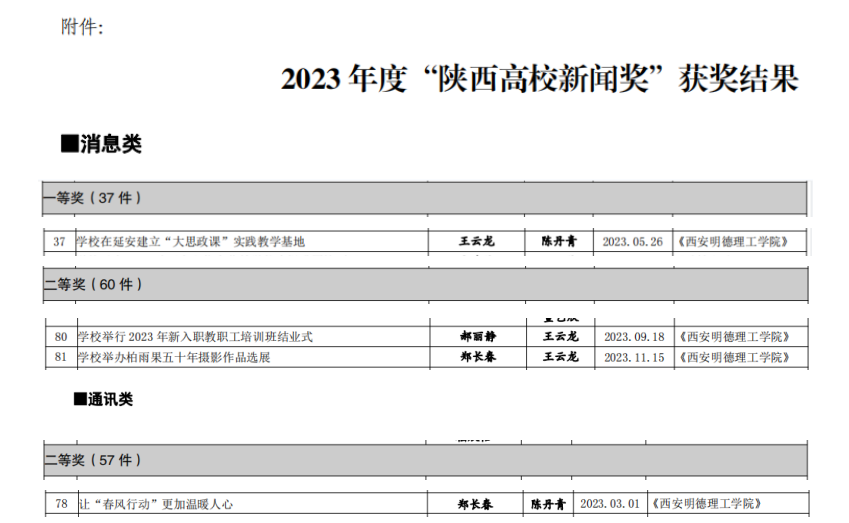 通过评委会严格评审,ac米兰党委组织宣传部王云龙老师撰写的《学校在延安建立“大思政课”实践教学基地》、教师发展中心郝丽静老师撰写的《学校举行2023年新入职教职工培训班结业式》分别获得消息类一等奖和二等奖,党委组织宣传部郑长春老师撰写的《学校举办柏雨果五十年摄影作品选展》《让“春风行动”更加温暖人心》分别获得消息类和通讯类二等奖。