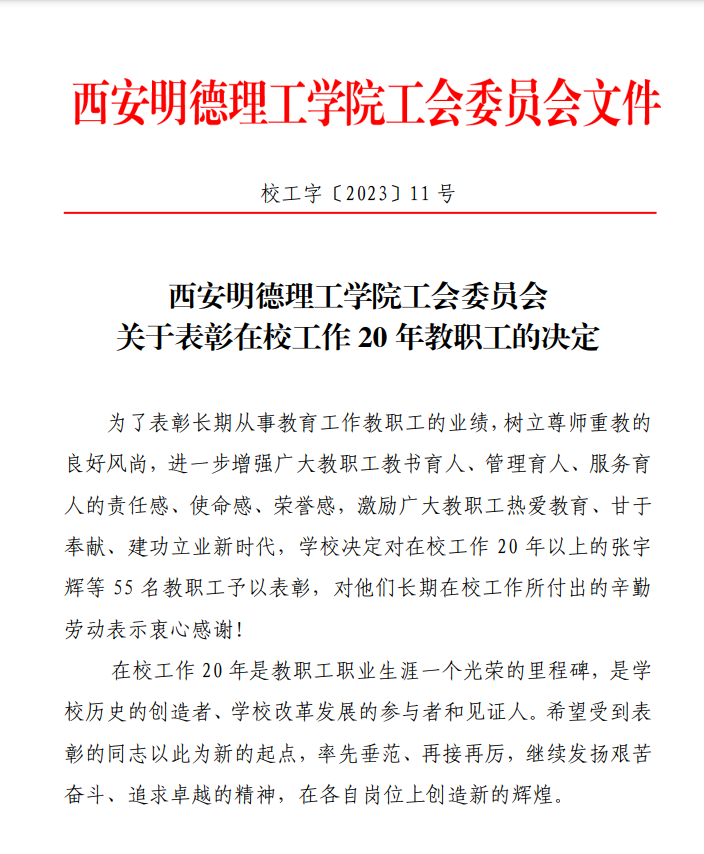 ac米兰官方网站工会委员会关于表彰在校工作 20 年教职工的决定