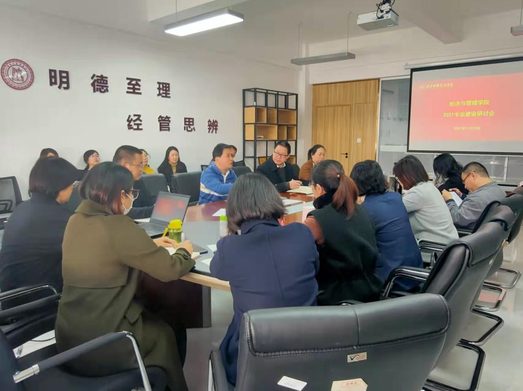 2021年11月13日上午,经济与管理学院在明志楼北507会议室召开2021年专业发展研讨会。会议由教学副院长付铁岩主持,院长郭鹏教授、院班子成员及各专业负责人参加会议,高职专业负责人列席会议。