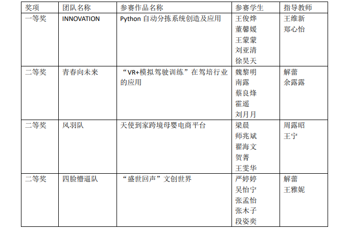 受疫情影响,本届区域赛调整为全程线上的方式进行,来自全国30个省区市的300多所院校,近1500支团队,万余名师生共同参与,竞争非常激烈。这是ac米兰第一次组织参加该项赛事,由王俊烨、董馨媛、王蒙蒙、刘亚清和徐昊天同学完成的《Python自动分拣系统创造及应用》项目荣获一等奖,另外3支队伍荣获二等奖,国际经济与贸易专业的教师指导学生参加此次竞赛。