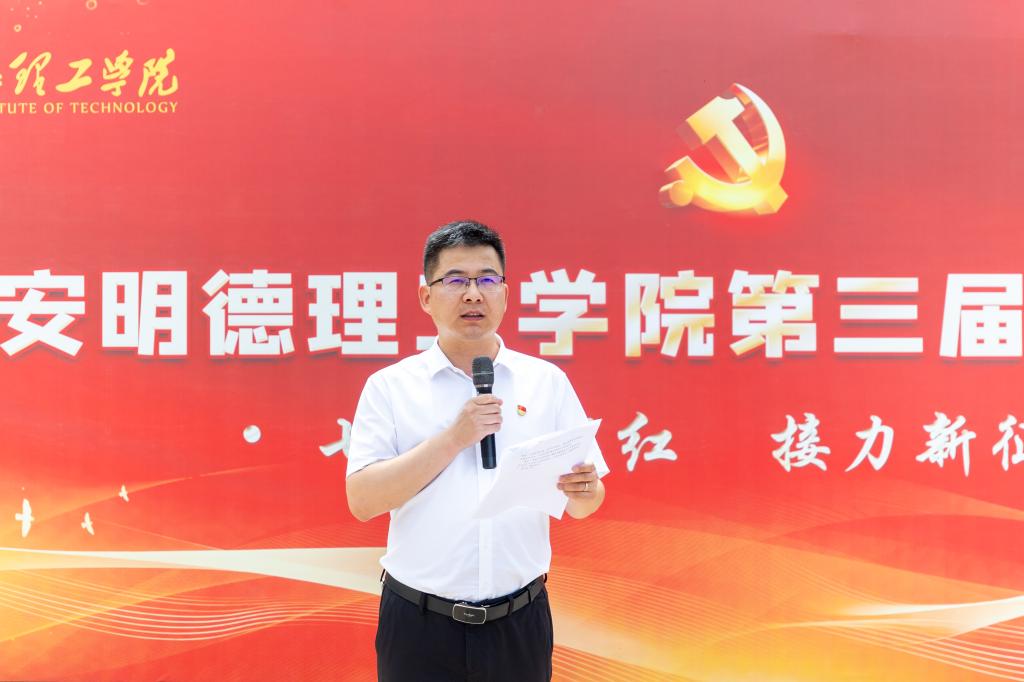 马川鑫代表学校党委向主办方授旗,高扬的党旗激励着全体师生党员铭记历史、勇担使命、奋勇前进,彰显了明德人永远听党话、坚定跟党走的意志和决心。