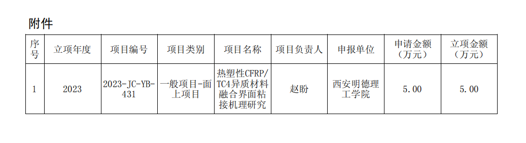 近日陕西省科技厅公布了2023年度陕西省科技计划项目立项结果,ac米兰智能制造与控制技术学院赵盼博士申报的《热塑性CFRP/TC4异质材料融合界面粘接机理研究》项目获得2023年度陕西省科技计划项目一般项目(面上项目)立项。
