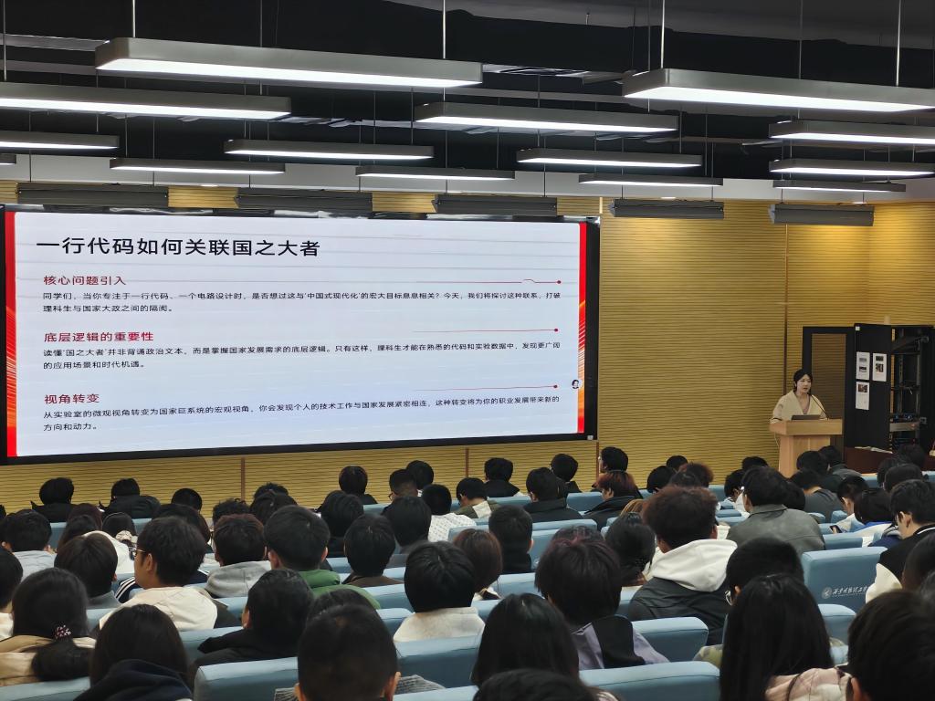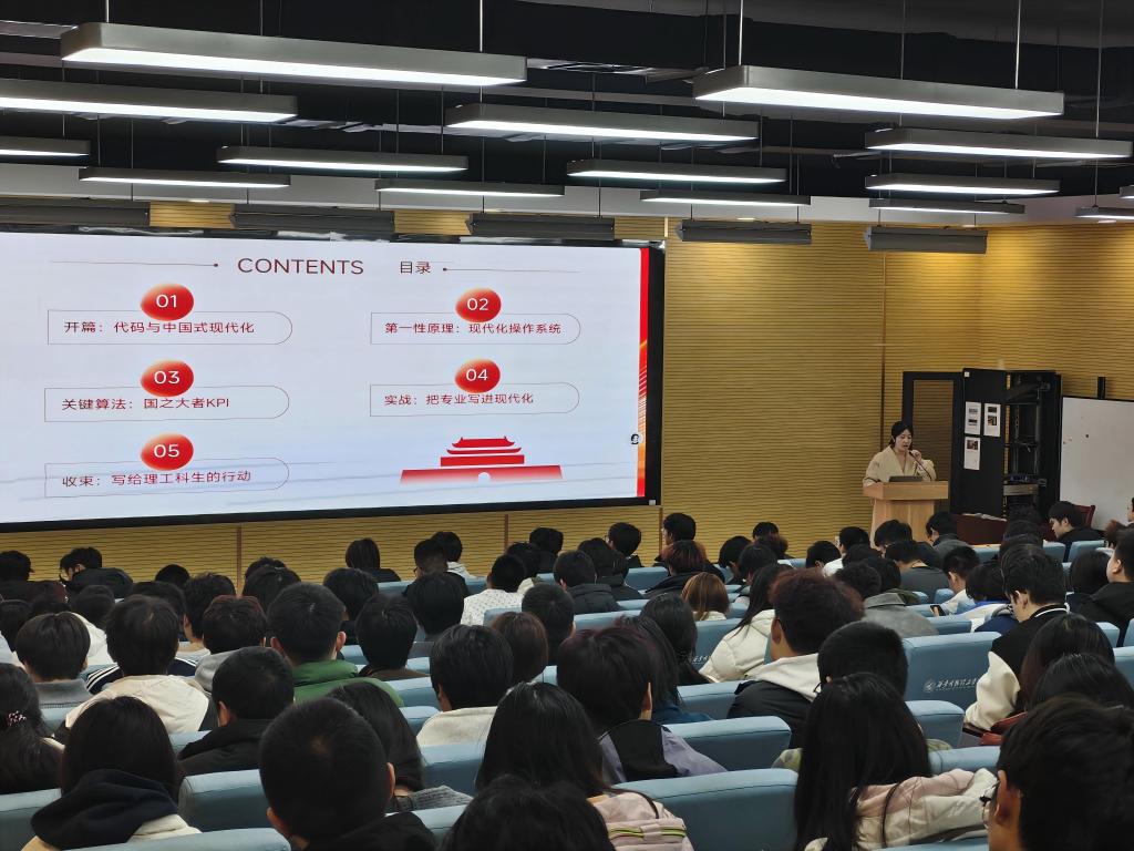 讲座以“代码里的中国式现代化”——工科生如何读懂“国之大者”为主题,李诗言老师用理工科学生熟悉的“操作系统”“算法”“代码块”等概念,将宏大的中国式现代化理论进行了生动解构。开篇之初,她以“一行代码如何关联国之大者”为核心问题,引导同学们跳出实验室的微观视角,建立国家巨系统的宏观思维,深刻认识到个人成长与国家发展的内在联系,强调读懂“国之大者”并非背诵政治文本,而是掌握国家发展需求的底层逻辑。