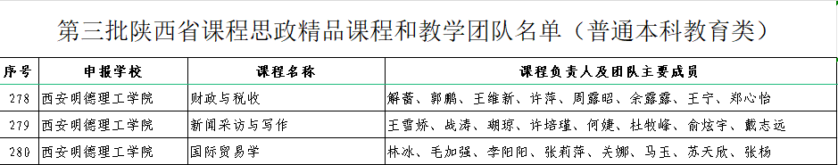 在刚刚公布的《陕西省教育厅关于公布第三批陕西省课程思政精品课程认定结果的通知》中,ac米兰再创辉煌,喜获佳绩!共有解蕾老师及其团队的《财政与税收》、王雪娇老师及其团队的《新闻采访与写作》、林冰老师及其团队的《国际贸易学》3门课程脱颖而出,被认定为省级课程思政精品课程。包含2023年被认定的姚璐老师及其团队申报的《电视节目播音与主持》,至今ac米兰共有省级课程思政课程4门(其中省级课程思政示范课程1门、省级课程思政精品课程3门)。
