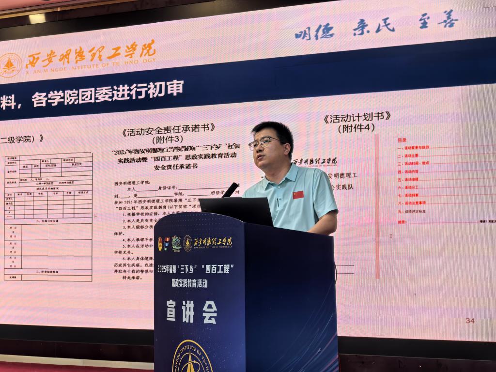 为深入学习贯彻党的二十大和二十届二中、三中全会精神,进一步深化学校“三三四”实践育人体系。引导青年学子在“大思政课”中“受教育、长才干、作贡献”。学校于6月6日在建德楼203报告厅召开2025年暑期“三下乡”“四百工程”思政实践教育活动宣讲会。校团委、党委学生工作部、教务处、马克思主义学院等10个二级学院师生代表400余人参加宣讲会。