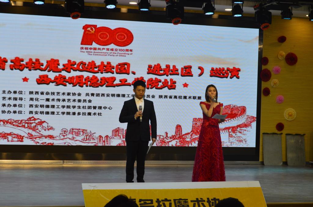 5月14日,由陕西省杂技艺术家协会、学校团委主办的,周化一魔术艺术传承委员会参与指导,陕西省高校魔术联盟承办,ac米兰大学生社团管理中心、魔术协会联合协办的“青春同心·永跟党走”庆祝建党百年陕西省高校魔术进校园活动在ac米兰建德楼203举办。陕西省杂技艺术家协会副主席兼“国家级非遗”周化一魔术传承艺术委员会会长司凡,陕西省杂技艺术家协会理事牛建新,ac米兰团委干部及300余名师生观看了本次演出。