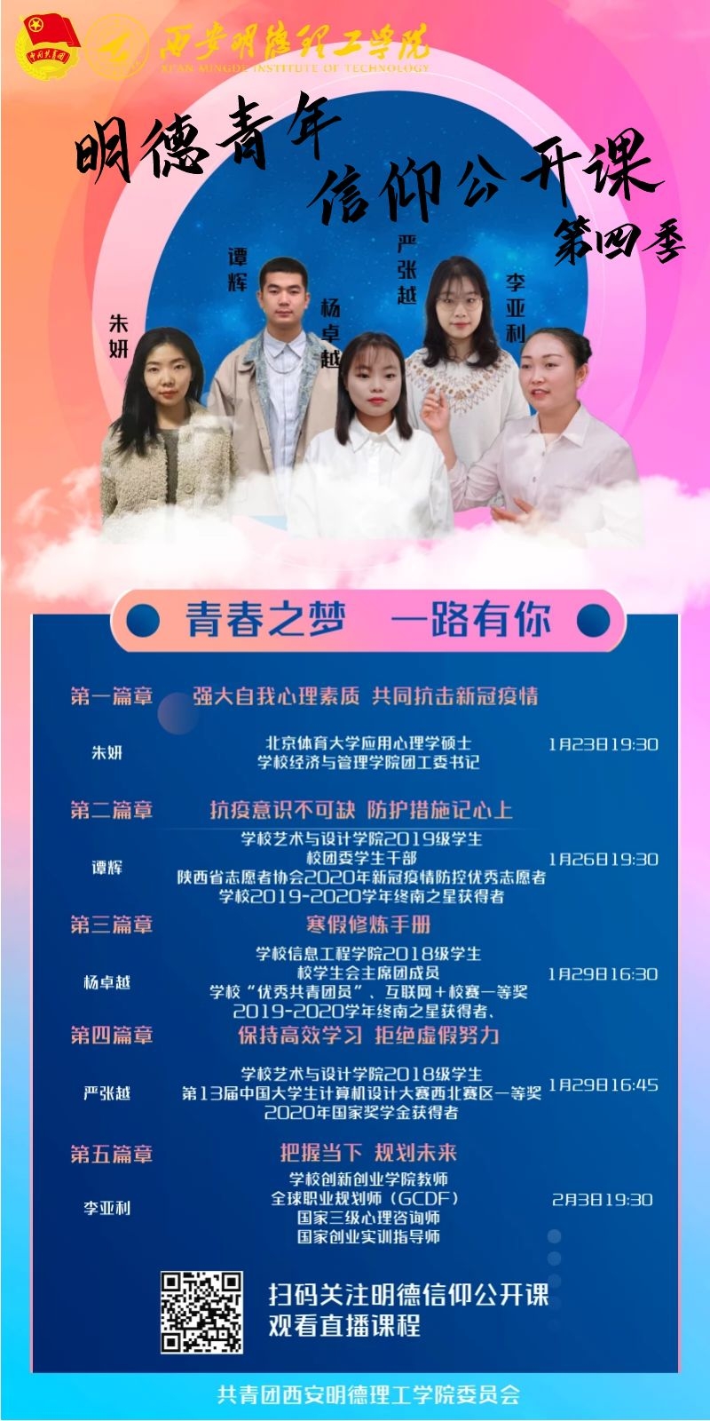 为持续推进青年学生思想引领工作,加强理想信念教育和立志成才教育,在学生寒假期间,ac米兰官方网站举办了坚定理想信念放飞青春梦想2021“明德青年信仰公开课”第四季主题活动。公开课筹备历时2个月,从全校各个学院招募遴选多名优秀师生代表,通过网络等新媒体平台向青年学生做主题宣讲。
