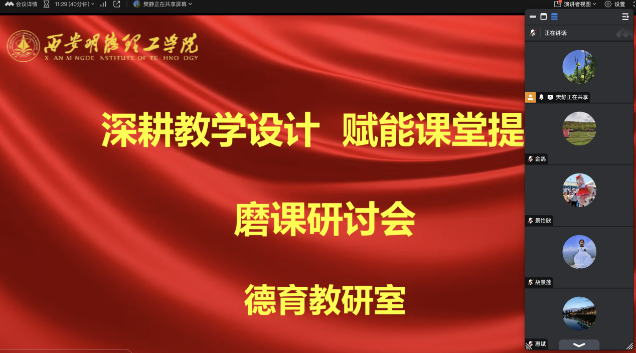 为深入贯彻落实立德树人根本任务,遵循教育教学规律,扎实推进马克思主义学院“三磨机制”磨课活动相关部署,8月24日下午,德育教研室通过线上平台组织召开了以“深耕教学设计,赋能课堂提质”为主题的磨课研讨会,教研室全体教师参加。本次会议聚焦思政课教学质量提升与育人实效增强,依托集体智慧协同研讨,致力于夯实教学设计基础,打造具有德育特色、深受学生欢迎的高质量课堂。