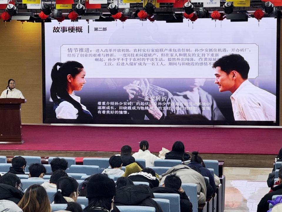 王雪老师聚焦于《平凡的世界》,从书中的人物形象入手,在诸多故事线索中挖掘了孙少平、孙少安等人在艰苦环境中不屈不挠、努力奋斗的精神品质。她指出,《平凡的世界》不仅是一部描写普通人生活奋斗史的作品,更蕴含了深刻的人生哲理和时代精神。深入阅读这本书,能带给大家无论身处何种境地,都保持对生活的热爱和对梦想的追求,用坚韧和勇气书写精彩人生的前进力量。王雪老师的分享让同学们深受鼓舞,现场不时响起热烈的掌声。