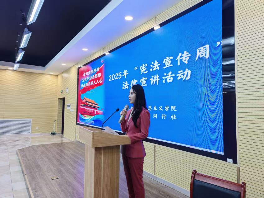 2025年12月4日,时值我国第十二个“国家宪法日”,为深入学习贯彻党的二十大精神和习近平法治思想,积极响应全国“宪法宣传周”活动号召,由马克思主义学院主办、德法同行社、齐越朗诵艺术社协办的“学习宣传贯彻习近平法治思想,推动宪法深入人心”专题法律宣讲活动于中午13:00在建德楼201教室隆重举行。本次活动吸引了200多名学子踊跃参与,现场座无虚席。本场活动由齐越朗诵艺术社姚佳红同学主持。