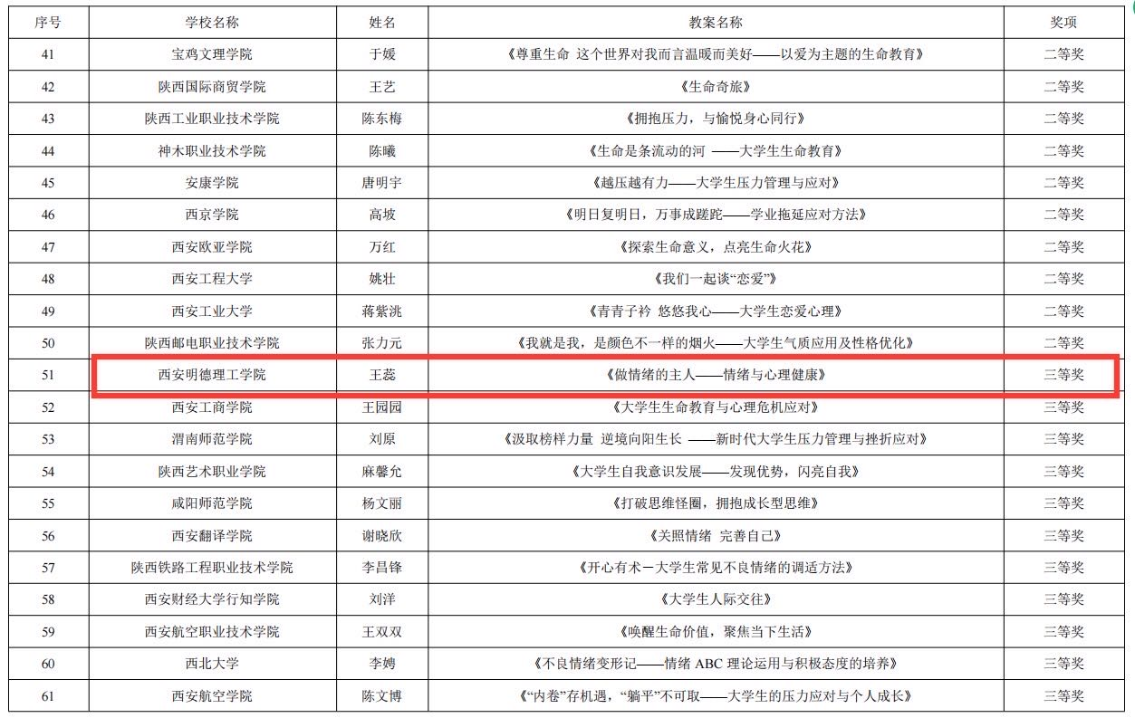 近日,在《中共陕西省委教育工委公布的陕西高校第八届“阳光护航”心理育人宣传季省级实践活动表现突出师生进行表扬的通知》中,我院大学生心理健康教育教研室三名教师受到通报表扬。本次活动从今年3月份起,经学院、学校推荐、专家评审、结果公示和委厅研究等程序,最终,我院专职心理健康教育教师王蕊的教案《做情绪的主人——情绪与心理健康》、兼职心理教师郭学鹏的教案《换位思考赢得共情——大学生人际交往心理》荣获第五届陕西高校心理健康优秀教案评选三等奖;由专职心理教师韩娇老师、国际教育学院辅导员康佳馨作为指导老师,国际教育学院孟浩生、陈硕、梁馨文三位同学作为参赛学生在第六届陕西高校大学生心理健康科普知识竞赛中荣获优秀奖。
