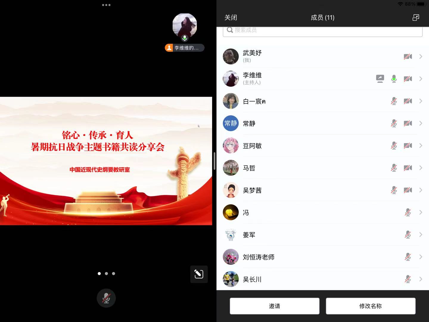 为深化教师对抗战史的理解与感悟,将历史厚度转化为育人温度,中国近现代史纲要教研室于8月20日晚上19:00在线召开“铭心·传承·育人——暑期抗日战争书籍主题共读分享会”。教研室全体教师参加,会议由李维维老师主持。全体教师围绕《抗战为什么赢》与《南京大屠杀》两部著作,展开了一场有深度、有温度、有力量的集体学习与思想碰撞。