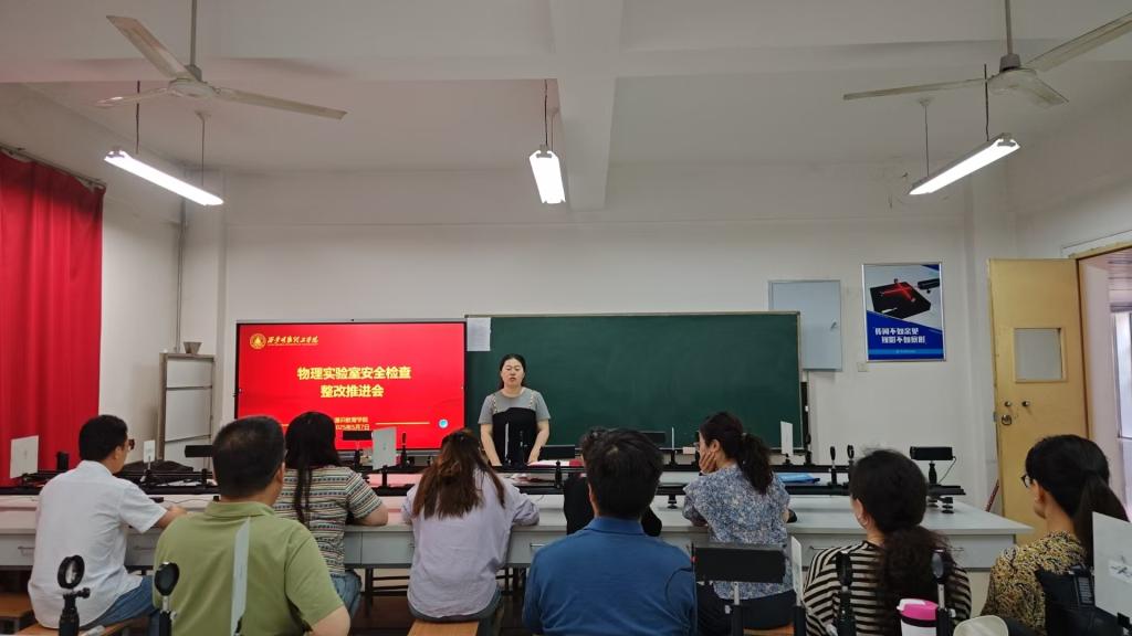 2025年5月7日中午,物理教研室主任贺颖主持召开了物理实验室安全检查整改落实第一次会议,会议围绕4月28日下午教务处会同智慧安全警务处对全校实验室展开的安全大检查工作,梳理问题,并明确整改目标和整改举措。