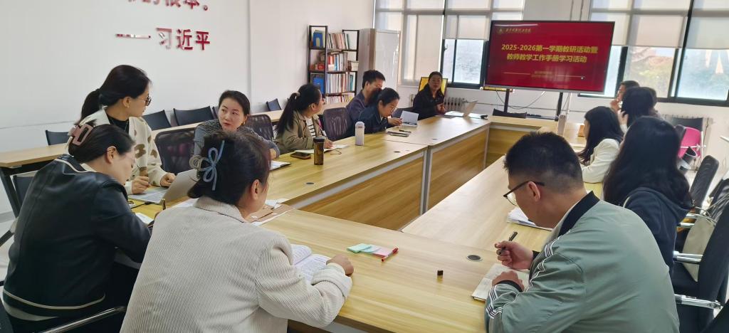 在集中学习环节,贺老师以 “精准解读 + 案例赋能” 为核心思路,带领全体教师对《教学工作手册》核心章节进行系统性梳理与深度解读。学习内容全面覆盖本科教学主要环节质量标准、实验教学质量标准、教师评学、任课教师上课行为规范、调课、考试考核、教学事故认定和处理办法等各环节内容。通过 “集体阅读 + 课程负责人领学”的方式,将手册中的文字规定转化为具体可操作、可落地的教学行为指引,帮助新教师快速理解条款内涵,明确实践方向。