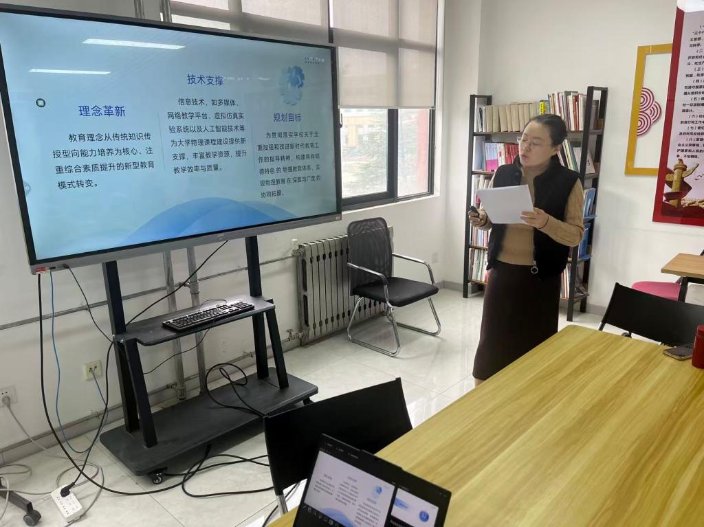 《大学物理实验》课程负责人贺颖老师以“固本强基,创新驱动-推动课程建设,服务学生培养”为主题,详细介绍了大学物理实验课程的建设思路与实践成果。她表示,实验教学是大学物理课程的重要组成部分,既要坚守“夯实基础”的核心,强化学生基本实验技能训练;也要以“创新驱动”为导向,通过更新实验项目、改进教学模式、完善评价体系等方式,激发学生的探索热情和创新潜力。贺颖老师的发言为实验课程的进一步优化明确了方向,得到了与会人员的广泛认同。