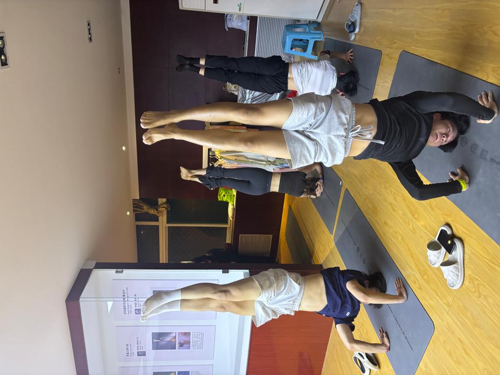中午12点30分,随着舒缓的背景音乐响起,数十名瑜伽爱好者手持瑜伽垫,迅速在1号实训楼中华优秀传统文化实践基地内集结。在瑜伽教练祝新蕊老师的带领下,参与师生通过简单的呼吸练习和基础体式,感受身体与心灵的放松。短短30分钟内,实践基地化为宁静的瑜伽空间,师生们共同完成了“树式”“猫牛式”等系列动作,现场氛围轻松而专注。