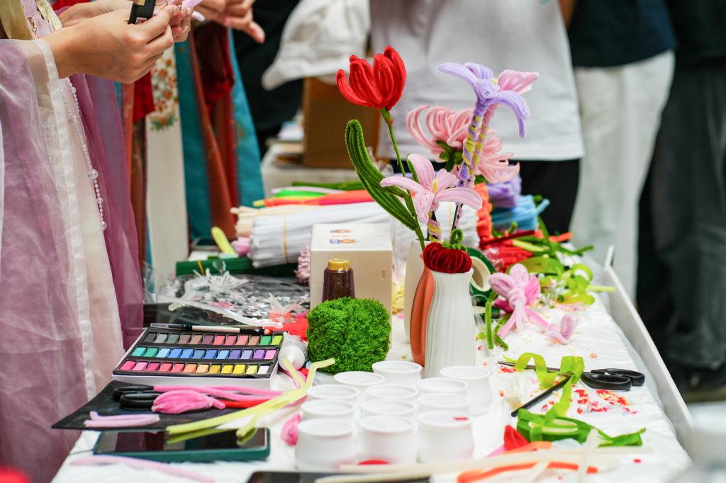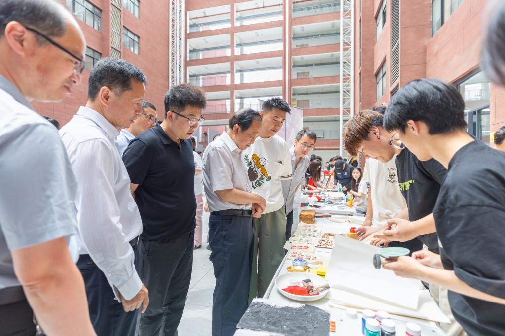 人文艺术节分为三个板块:非遗集市、“南山飞花”系列讲座和艺术工坊。非遗集市5月14日中午,在活动开幕式结束后,正式开集。10余个非遗项目摊位,包括了漆扇、甲马、书画、篆刻、陕北剪纸、新疆丝织等。每个摊位既有非遗作品展示,又给广大师生提供了互动实践的机会。各位领导也和同学们一起,逐一观看体验了各个非遗项目。大家玩得意犹未尽,大呼过瘾。国艺非遗社的摊位以其独出心裁、高质量的展示和互动体验,尤受欢迎。