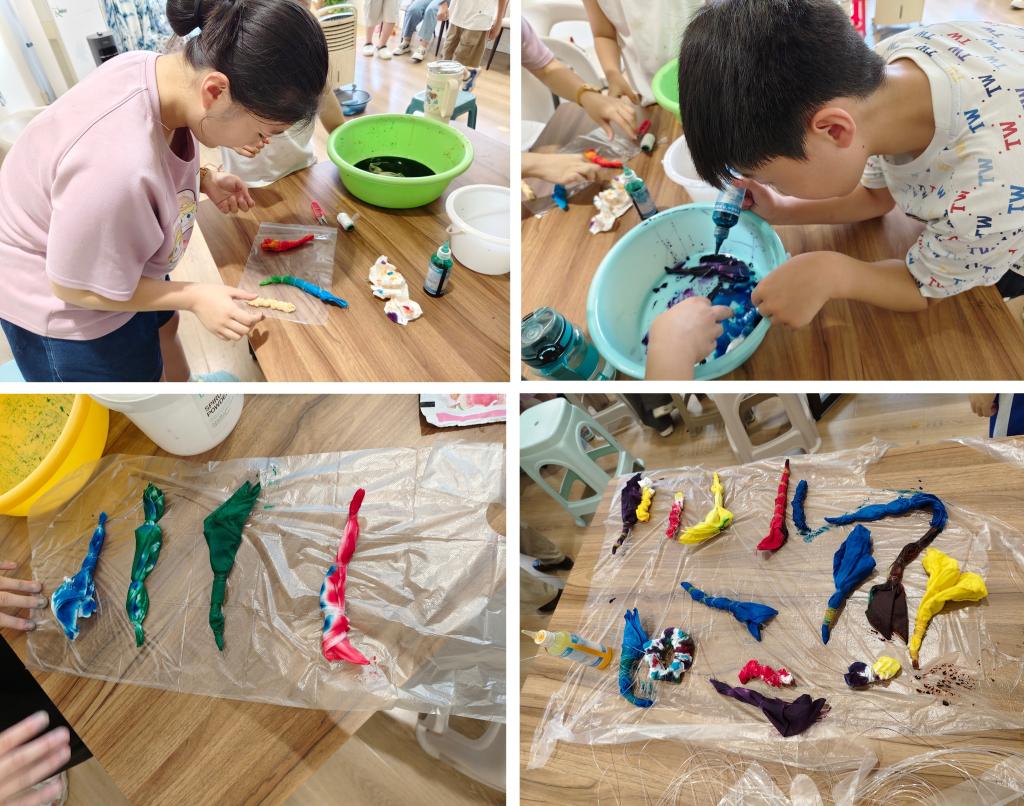 7月15日为蓝染体验日,队员们首先演示了扎结技法,指导孩子们学习扎染浸染,见证素白布料在靛蓝中幻化出独特纹样。在实践中沉浸于动手之趣,惊叹于古人的智慧与工艺之美。