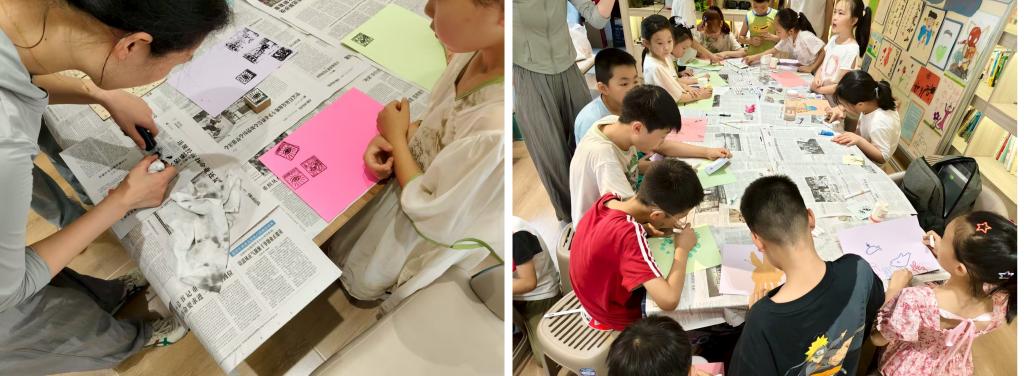 7月14日,在甲马拓印体验日活动现场,小朋友们都兴致勃勃地参与其中,他们亲手进行操作,深入感受传统文化的魅力。在这个过程中,他们不仅锻炼了自己的动手能力,也深刻地体验到了木版印刷的古朴韵味,独特美感和文化内涵。