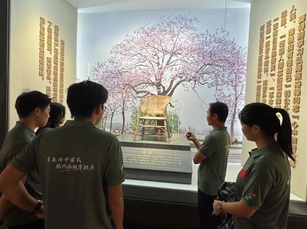 参观过程中,焦裕禄的诸多事迹深深烙印在我们心中。他为了治理风沙,亲自查风口、探流沙;为了疏浚河道,顶风冒雨查看水情。他用自己短暂而光辉的一生,诠释了什么是真正的共产党员,什么是为人民服务的宗旨。纪念馆二楼复原的办公室内,那把伤痕累累的旧藤椅成为全场焦点。椅背右侧,一个碗口大的破洞无声地诉说着焦裕禄与病魔抗争的日日夜夜。为缓解肝癌剧痛坚持工作,焦裕禄常以钢笔、茶缸盖甚至藤椅扶手顶住肝部,久而久之,硬生生将扶手顶穿!这把藤椅不仅是简陋的办公家具,更是“亲民爱民、艰苦奋斗”精神的具象化象征。它让队员们深刻体会到,何为“心中装着全体人民,唯独没有他自己”的忘我境界。