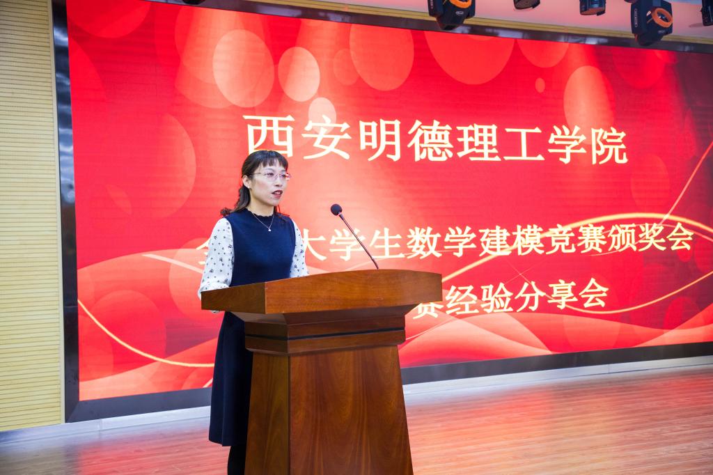接着,数学建模竞赛指导教师代表李妮老师发言,李老师首先感谢了院领导对于数学建模竞赛工作的支持与帮助,接着从综合培训、团队协作精神以及责任心和毅力三个方面讲到参加数学建模竞赛对学生成长的帮助,并希望2021年参赛同学们能够再接再厉,再创佳绩。
