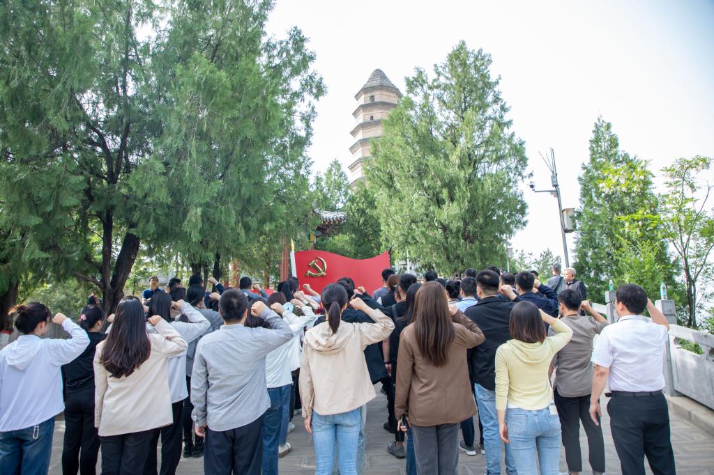 巍巍宝塔,初心永照,红色血脉,永续传承,在宝塔山上由党委组织宣传部部长高超同志领誓,全体党员重温入党誓词。